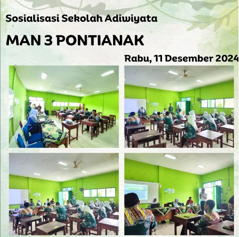 Pontianak – Dalam rangka mewujudkan madrasah yang peduli lingkungan, MAN 3 Pontianak melaksanakan kegiatan Sosialisasi Sekolah Adiwiyata pada Rabu, 11 Desember 2024. Acara ini diikuti oleh dewan guru serta tenaga kependidikan yang berlangsung di ruang kelas dengan suasana penuh semangat. Dinas Lingkungan Hidup dan Kehutanan Provinsi Kalbar langsung hadir memberikan sosialisasi kepada para guru dan tenaga kependidikan MAN 3 Pontianak.