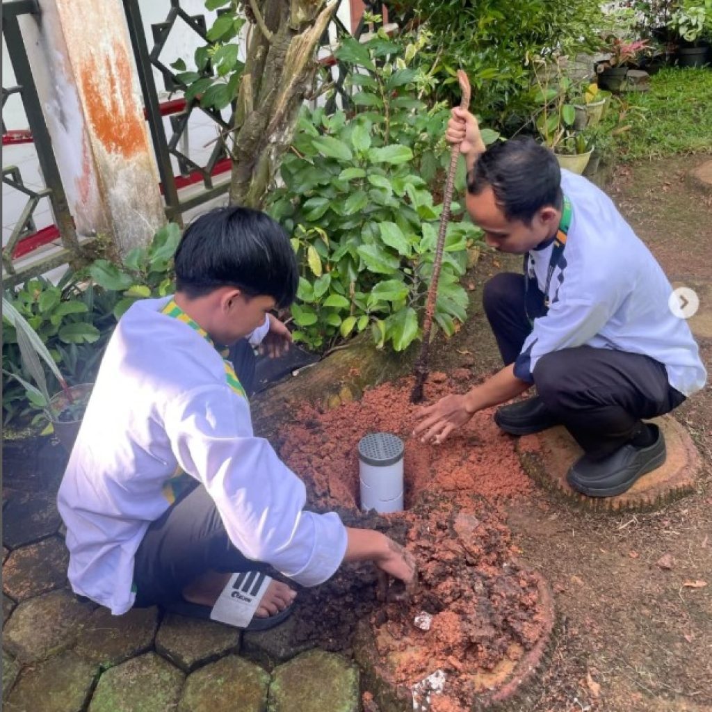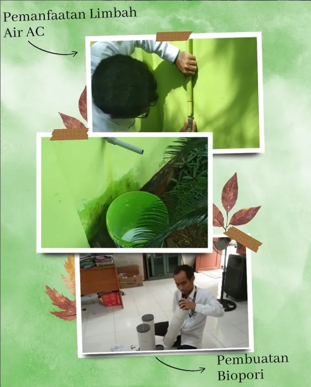 Air tetesan AC yang biasanya terbuang sia-sia, kini dimanfaatkan kembali untuk menyiram tanaman di sekitar madrasah. Sementara itu, pembuatan lubang biopori dilakukan di beberapa titik halaman sekolah untuk meningkatkan daya resap air, mengurangi genangan, sekaligus memperbaiki kualitas tanah.