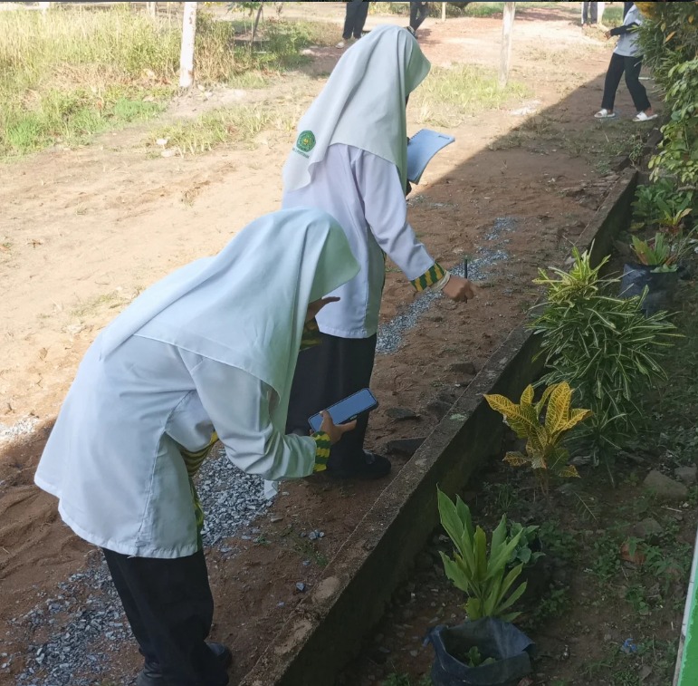 Siswa tampak berkeliling halaman madrasah, mencatat serta mendata berbagai jenis tanaman yang tumbuh di sekitar area sekolah. Pencacahan ini bertujuan untuk mengetahui jumlah pohon yang ada sekaligus memetakan kondisi lingkungan hijau di MAN 3 Pontianak.